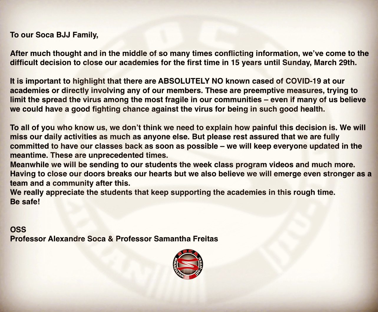 To our Soca BJJ Family, After much thought and in the middle of s...